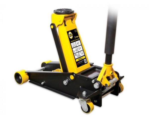 Cric de garage avec double cylindre. Grâce aux roues en PU, plus de dommages au plancher de l’atelier. Le levier est doté d’une couche de revêtement en mousse.